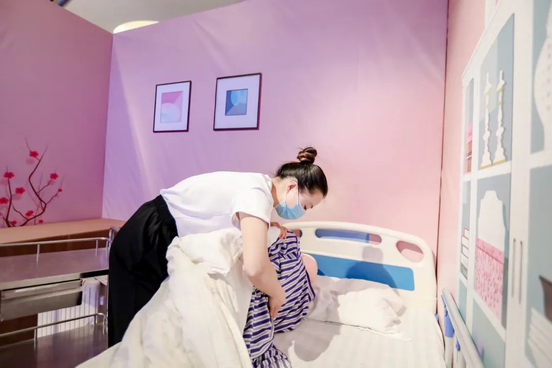 在比赛现场,选手们集中精力,展示自己的“绝技”。在母婴服务领域,选手们一只手握住新生儿的腰臀,另一只手握住五指空心,轻轻拍打孩子的背部,帮助孩子以垂直抱、侧卧、揉腹等形式打嗝排气。在养老技能赛区,选手们通过调整老人的卧位,轻敲老人的背部,帮助老人翻身排痰。