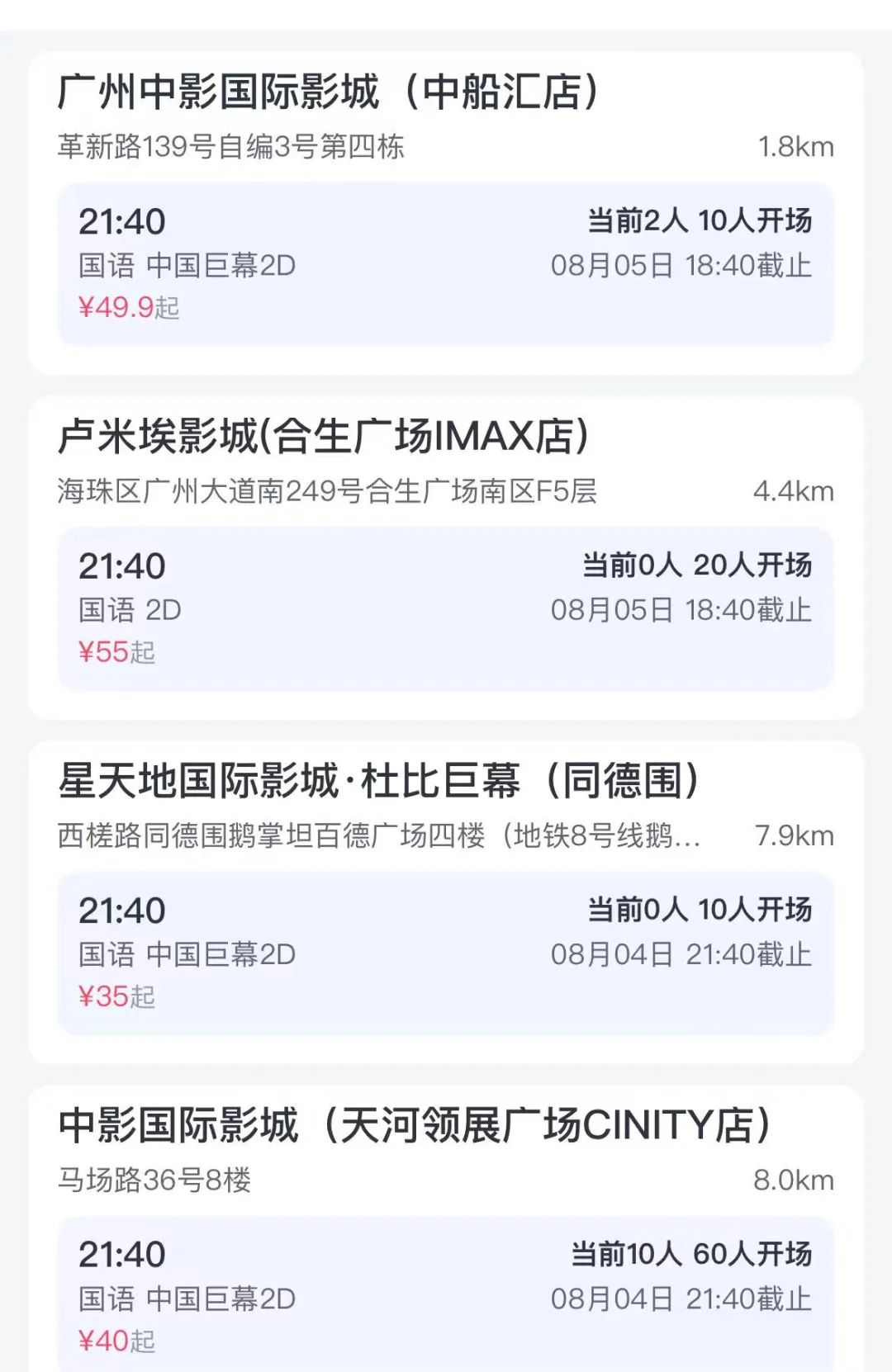 为了保证基本收入,参与播出的影院设置了至少10人组成一个团体,最多90人组成一个团体。截至发稿,8月5日羽毛球男单决赛广州5家电影院均未达到开场人数要求。