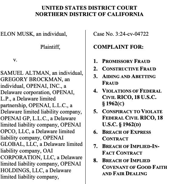 具体而言,当时的起诉书显示,马斯克控告 OpenAI 在 2023 年违背了 OpenAI 成立时的《成立协议》。