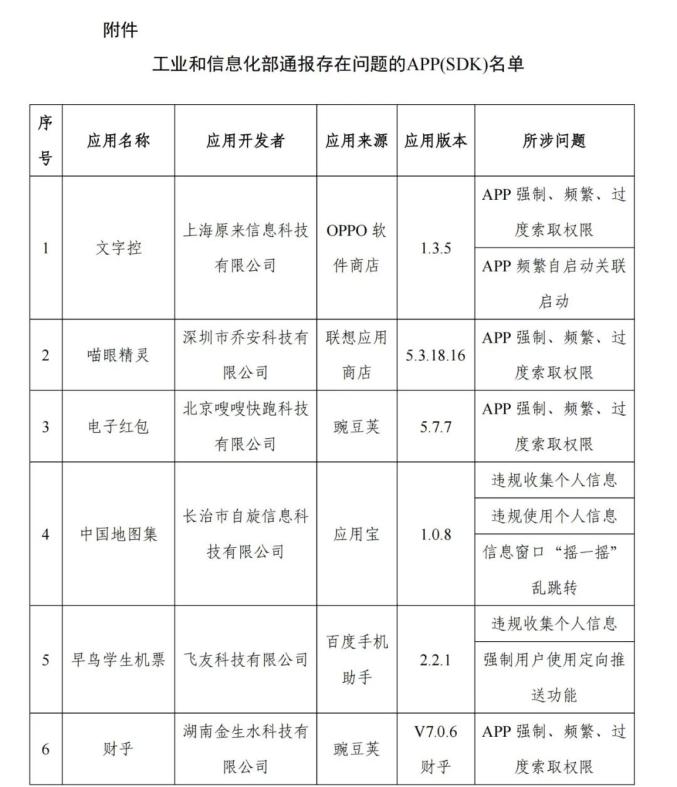 工业和信息化部高度重视用户权益保护。根据《个人信息保护法》、《网络安全法》、《电信条例》、《电信和互联网用户个人信息保护条例》等法律法规,不断整改App损害用户权益的违规操作。近日,工信部组织第三方检测机构抽查,发现17款App和SDK损害用户权益(详见附件),现通知。