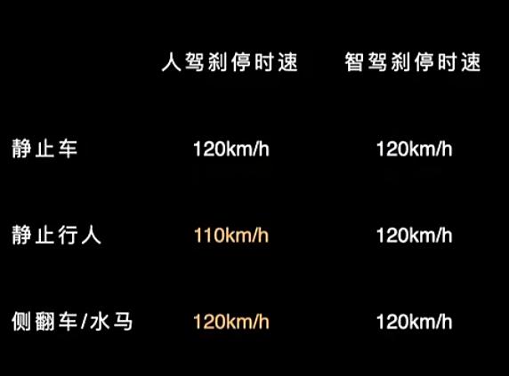 随后,华为主要的主动安全功能也更新。对于静止车辆和侧翻车。 / 无论是人驾还是智驾,水马, AEB 都可以做到 120km/h 刹停。