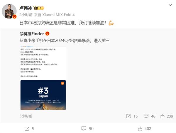 日本小米手机出货量暴涨359%,进入前三!卢伟冰:继续加油