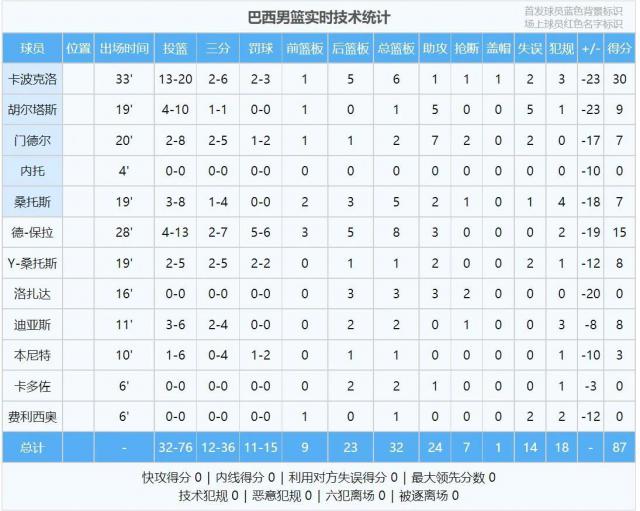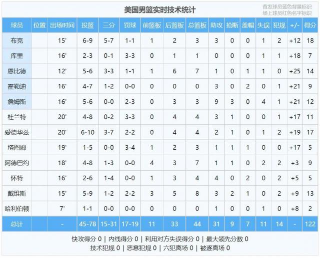 87 分数已经不少了,但是美国队的进攻火力太猛了!每节 10 在几分钟内,整个狂轰 122 分。美国队 6 人类得分上双,布克 18 分 3 篮板 3 助攻,全队最高分。卡波克洛狂轰滥炸 30 六!其它玩家的数据,可以看到数据截图: