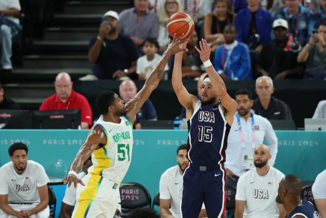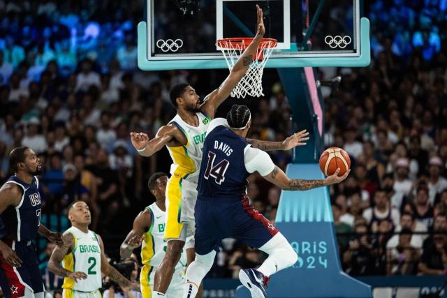 最终谈到美国对巴西的比赛,美国首发是三后卫:库里,布克,霍勒迪,詹姆斯,恩比德。巴西首发:胡尔塔斯,门德尔,桑托斯,内托,卡波克洛。詹姆斯首发 4 记住助攻,美国队 16-6 打停巴西。41 霍勒迪限制了胡尔塔斯。