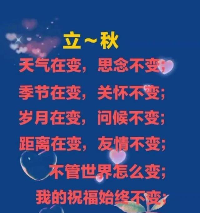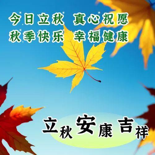 秋天的第一个节气到了,祝你好运,好运作为头罩,祝你工作顺利,工作顺利;秋雨凉爽,舒适,轻松,快乐,美丽。祝你年轻健康;秋风吹,百果香,硕果累累,满仓堆积。祝你感情甜蜜幸福;立秋节气,祝你万事如意。