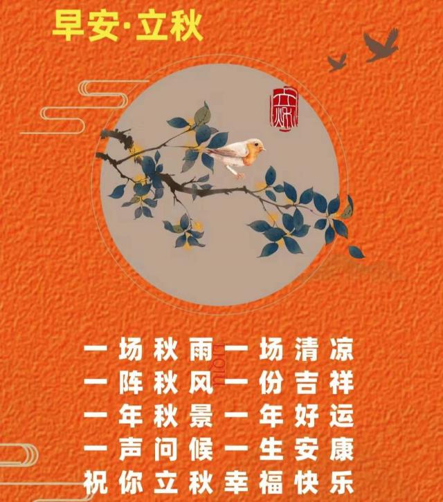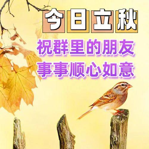 立秋到了,我的祝福及时到了!天高云淡,天气好,炎热的夏天远去;落叶知秋枯叶,善良如酒。天气凉爽,不开心,更安心。问候是深情和正义的。祝朋友们:立秋快乐,身心健康!
