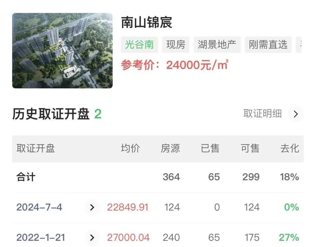 在第三方平台上,渠道经纪人小张告诉《国家商报》记者,南山锦宸项目于2022年初备案取证。当时平均精装价格一度达到3万元/平方米,也是光谷三环外第一个高层建筑项目,突破了每平方米3万元的备案价格。
