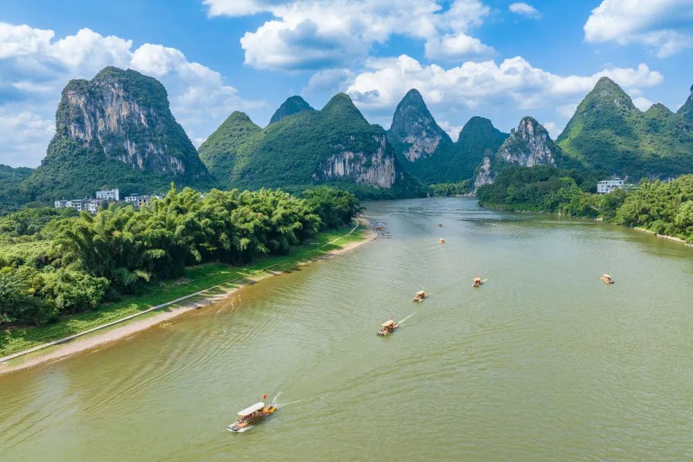 ● 划过漓江,享受清爽。暑期旅游旺季,广西桂林市阳朔县漓江河段,大家乘坐竹筏游览漓江沿岸风光,欣赏美景,享受清爽。