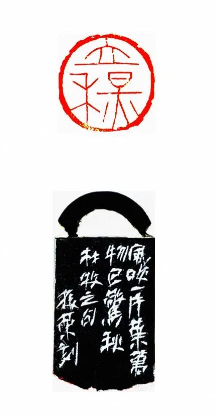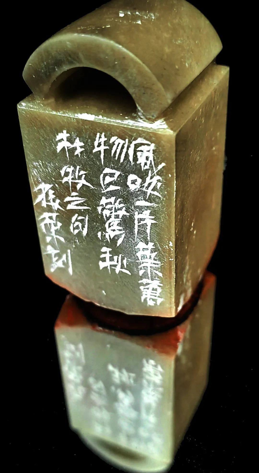 这个“立秋”印章是朱文印,采用法古玺风格。它的技巧错落有致,优雅美观,周围长度变化极大,呈现出一种简单的美。印刷石采用瓦当钮青田石。印章顶部设计成瓦当形状,造型独特。青田石温文尔雅,色彩丰富,视觉效果好。