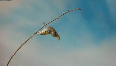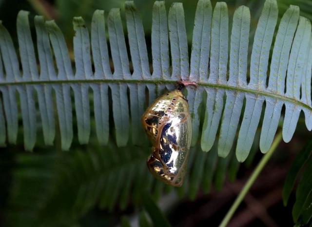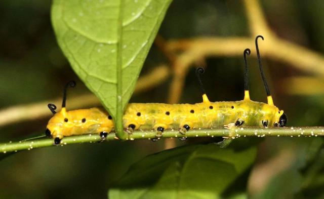 蓝色斑点蝴蝶的幼虫和即将变成蝴蝶的蛹。南兆旭摄