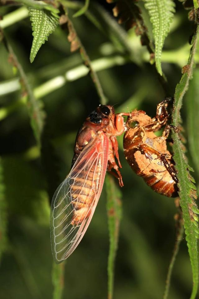 羽化中的黑蚱蜢蝉。爬在树杆上的若虫壳从头到胸破裂,蝉像新生儿一样慢慢爬出来。白如玉、图案优美的蝉翼慢慢张开,从此一生正式完善。南兆旭摄