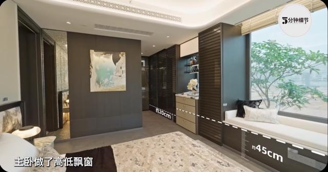 那是大约的建筑面积 149 平米房型主卧内很浮夸。 270 度 U 形状凸窗,为主卧套房带来超广角视线。