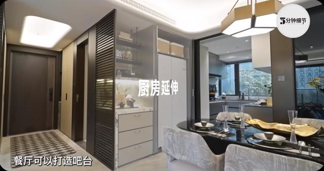 此外,还可以改造成西式厨房,改造后的西式厨房、中式厨房和餐桌之间的动线也经过了科学的规划。