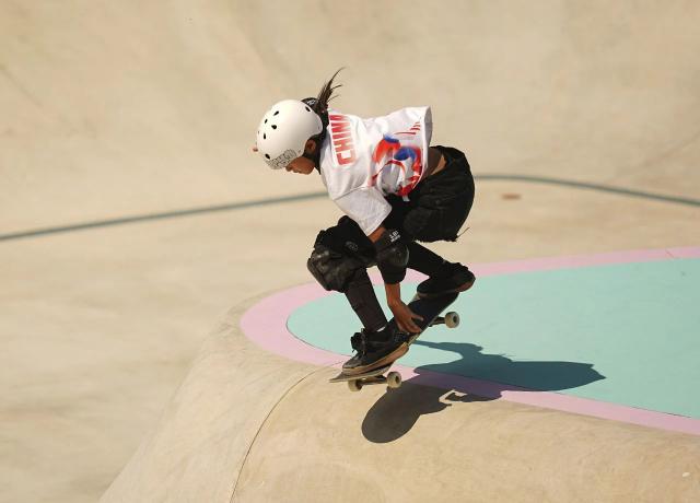 滑板女子公园赛预赛,最年轻的中国代表团选手,11 岁郑好好得到 63.19 分,位列第 18 名字错过了决赛。