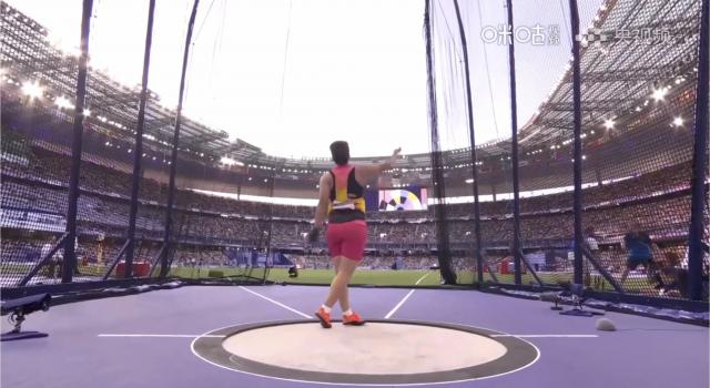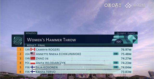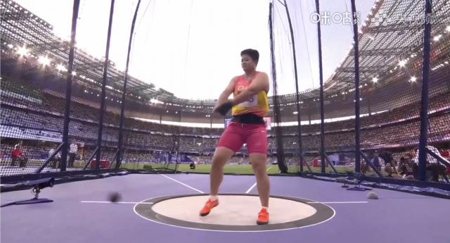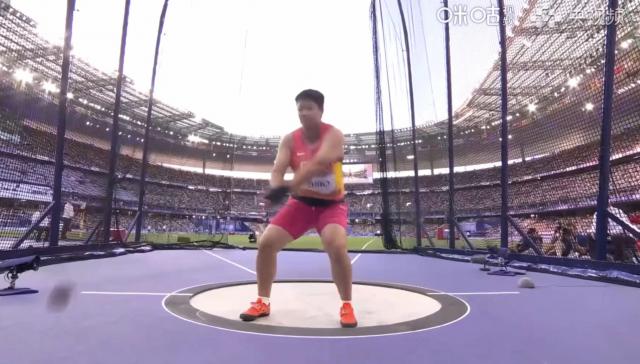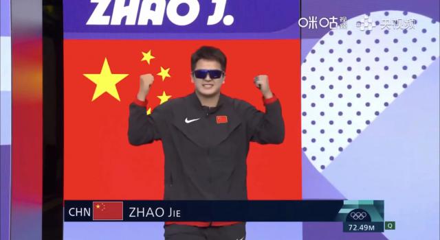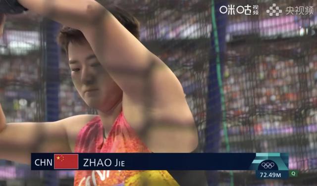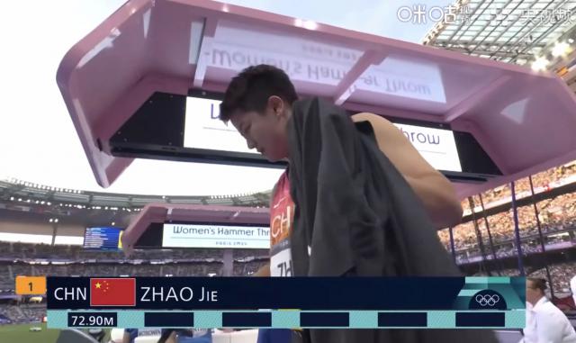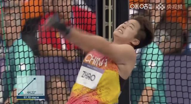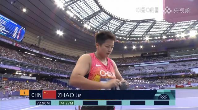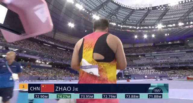 赵杰的第二次抛掷 74 米 接近自己最好的成绩,第二轮之后暂时排名第一。
