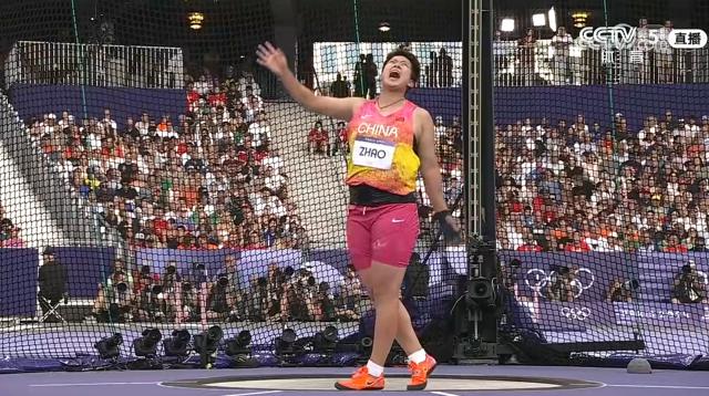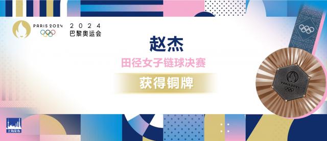 中国选手赵杰在今天早晨结束的田径女子链球决赛中, 74 米 27 获得铜牌。祝贺赵杰!
