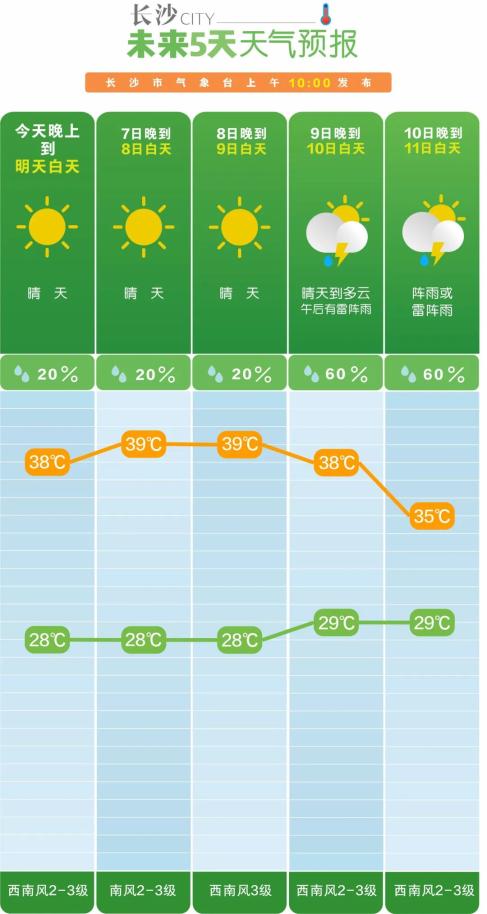 湖南省气象台预计,未来一周全省前晴后雨,雨量较少。其中湘西北局有阵雨或雷雨,局部有大雨,湘东南局6日有阵雨。气温略高,9日前全省高温范围扩大,强度增加。具体来说: