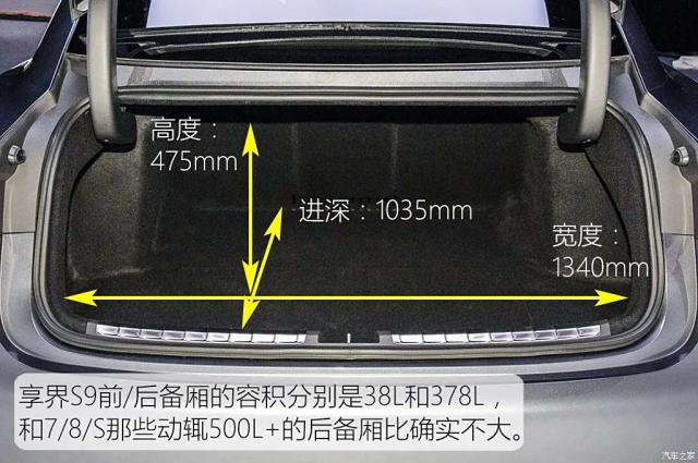 享界 S9 前 / 后备箱的容积分别为 38L 和 378L,和 7 系 /A8/S 级那些动辄 500L 后备箱容量不大。但它的优点是分布更多。例如,它有一个前备箱,后备箱挡板下面有一个整洁的区域来存放物品。