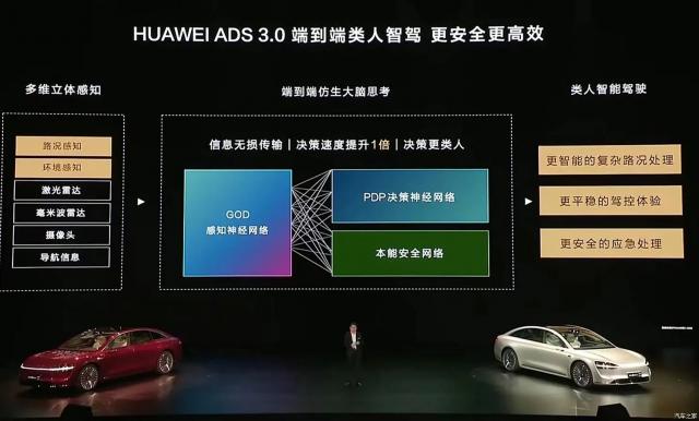 全新的 HUAWEI ADS 3.0 这个系统可以实现从 A 点至 B 点、车位到车位的全场景贯通,全新的端到端架构。第一,它升级到系统内部信息传输上。 GOD 大型网络,进一步优化信息传输速度和整合能力。第一个全向防撞系统 CAS 3.0,前向 AEB 支持车道外斜穿梭车辆识别,增加路面自适应性 AEB,提前预测精确刹停。