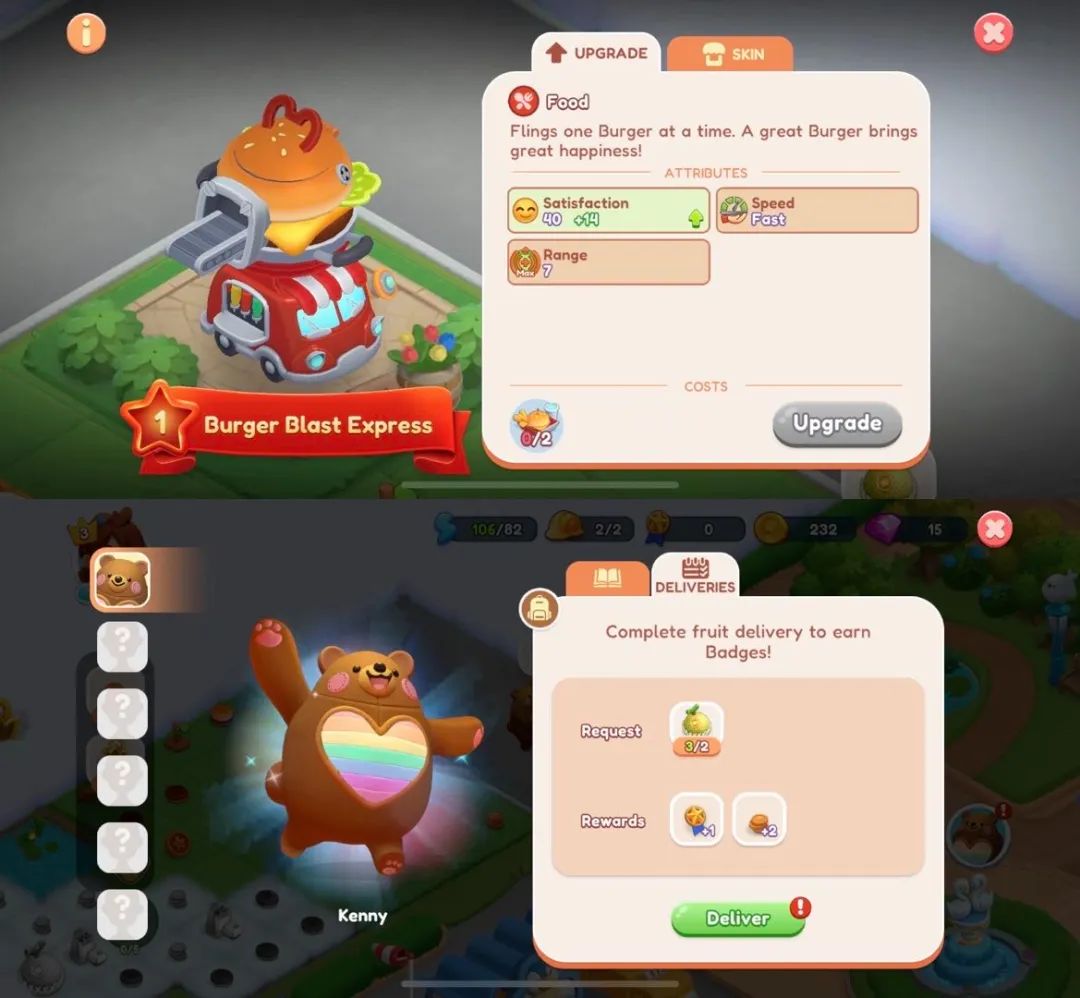 在生成阶段,塔防部分将根据玩家满意的游客数量进行评级,完成足够多的塔防副本可获得体力等资源奖励。其中比较有意思的是,平时都在。 Merge 3 只作为 NPC 情节人物,在「Merge x Fiesta」在塔防模式下,里面可以直接作为“将军”参战,释放特殊技能,让玩家尽可能地满足游客。比如玩具熊“Kenny“游客速度可以暂时降低。