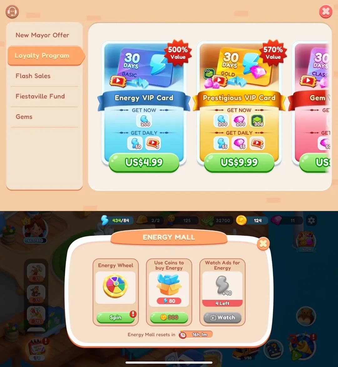 主线和其它游戏 Merge 3 类似的商品,玩家需要生成各种各样的物品,完成订单,从而实现升级,解锁更多的区域建筑,遇见更多 NPC,经营虚拟的“嘉年华”(Fiesta)"活动,这些套路类似于其它合成游戏。