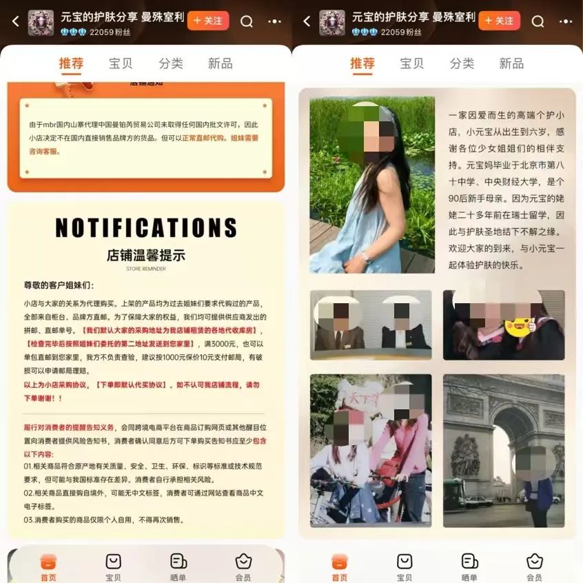 据该店首页介绍,“元宝护肤分享”是一家因爱情而诞生的高端护理店。店主元宝妈妈是一位90后的新妈妈,有北京市第八十中学和中央财经大学的学历,家里三代人都定居海外,可以“与护肤圣地结下不解之缘”。