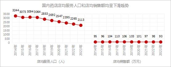 而且由于药店之间的距离越来越短,商店与商店之间的人流竞争越来越激烈,商店平均服务人口和商店平均销售额正在下降。并且结合中康CMH发布的《2024年半年度药店生存报告》,根据七普的居住人口数据,全国各地药店均服务只有2000人,甚至部分地区只有1000多人,已经接近生存的临界点。