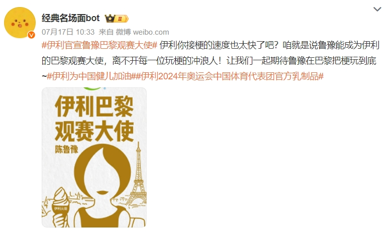 此外,伊利还在网上推广社交媒体互动和“听力和说服营销”。网友认为运动员的国风宣传照不错,要求“把这张硬照包装起来”。伊利立即成立了巴黎定制专项团队,连夜画出了功夫装产品的新包装设计稿。本届巴黎奥运会的标志被中国网友戏称为“撞脸鲁豫”,伊利邀请鲁豫担任其品牌优酸乳“巴黎形特别像使者”,并通过梗形成二次传播。