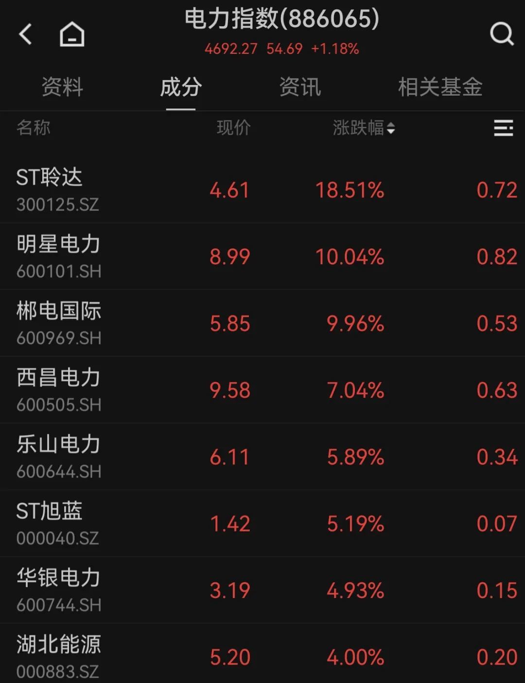 下午,电力板块上涨,明星电力、郴电国际涨停,九洲集团涨幅超过18%,西昌电力、乐山电力、大连热电、华银电力迅速跟上。