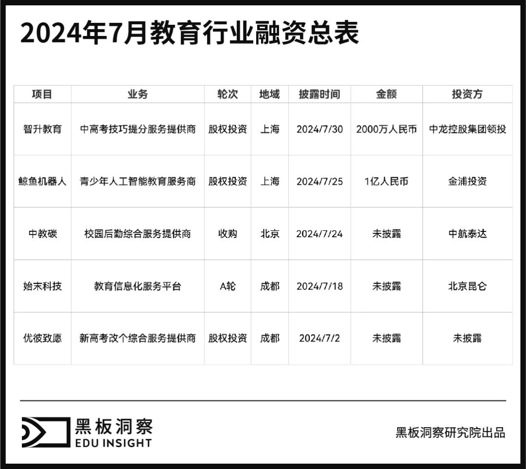 2024年7月,教育行业发生了5起融资事件,融资总额为1.2亿元,即教育信息服务平台A轮融资始末科技完成,投资者为昆仑信托。鲸鱼机器人完成第七轮融资,上海体育事业基金由上海九事集团、陆家嘴集团、上海投资、五星体育传媒等国有平台共同设立,融资金额超过1亿元。智升教育获得2000万融资,中龙控股领先。在2022年6月完成B轮融资后,成都优彼致愿教育科技有限公司再次获得资本市场补充融资,用于推动教师数字业务发展的全国布局。收购中教碳(北京)能源有限公司(以下简称“中教碳”)的北京中航泰达环保科技有限公司,成为其单一大股东。