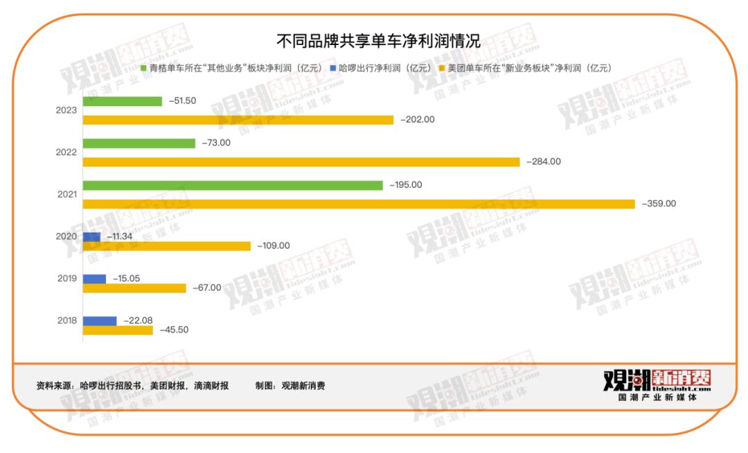 滴滴将青桔自行车纳入其他业务领域,并未直接公布青桔自行车的亏损情况。但根据滴滴的财务报告数据,2021-2023年,青桔自行车所在的“相关业务”板块也处于亏损状态,2023年该板块亏损51.48亿元。