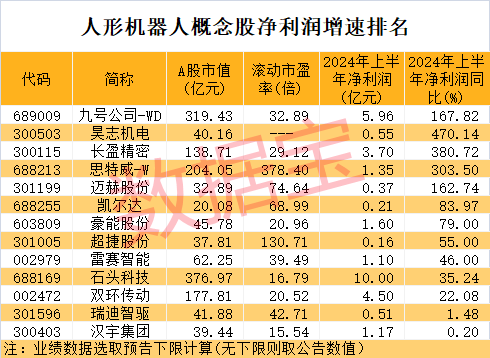 据证券时报数据宝统计,根据目前公布的业绩数据,上半年13只人类机器人概念股净利润同比增长(包括扭亏增盈),按照预测纯利润下限计算(无下限取公告值)。九号公司-WD、昊志机电均已率先披露中报,公司净利润均实现大幅增长。
