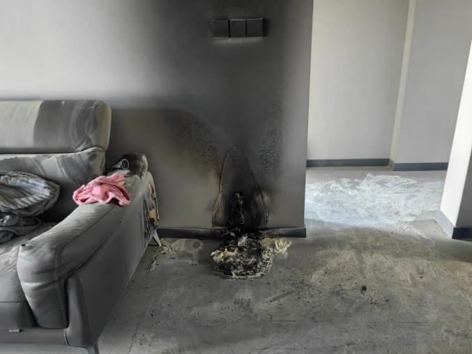 2024年2月,在广东省梅州市,一对夫妇从家乡回来后惊讶地发现,他们的房子的墙壁和路面都被熏黑了,客厅角落里的扫地机器人被烧得面目全非,家里的两只猫都死了。