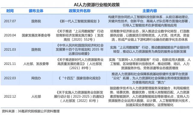 中国政府高度重视人工智能产业的发展,推动人工智能产业的发展 AI 为了加快应用端和场景端的渗透,核心的新生产力。早在 2017 2008年,《新一代人工智能发展规划》提出要构建开放协同的人工智能技术创新体系,推进 AI 技术广泛应用于经济和社会的各个领域,鼓励企业创新和选择 AI 提高人力资源管理智能化水平的技术。2022 2023年,人力资源领域专项规划《人力资源服务业创新发展行动计划》(2023年) — 2025 2008年)颁布,强调企业需要利用大数据、云计算、人工智能等新技术,加快实现业务数据化、运营智能化,支持有条件的人力资源服务龙头企业打造集成数字平台,提高系统集成水平。智能决策和服务能力的形成数据驱动。对于中小企业来说,政策鼓励企业从迫切需要数字化转型的业务环节入手,加快数字化办公和业务在线管理的应用,逐步扩展到整个业务全流程的数字化升级。