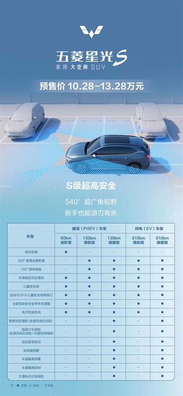 快科技 8 月 8 每日新闻,五菱最重的新能源 SUV 星光 S 预售已经开始,其中插电式混合动力三款,价格是 10.28-12.28 一万元;纯电版两款,价格是 12.28-13.28 万元,现在,这款车的详细配置已经公布。