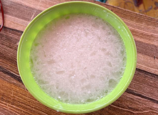 用纱布包裹假酸浆种子,在水中不断揉搓,然后加入混合好的清石灰浆搅拌混合,静置。 1~3 一小时后,就可以得到晶莹的胶状物质,就是云南人常说的木瓜凉粉——其实和四川冰粉很像。