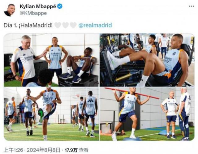 在当地时间,法国前峰姆巴佩来到皇马基地报到。 8 月 7 第一天参加皇马合练,晒出照片并配文:“第一天,Hala Madrid "。