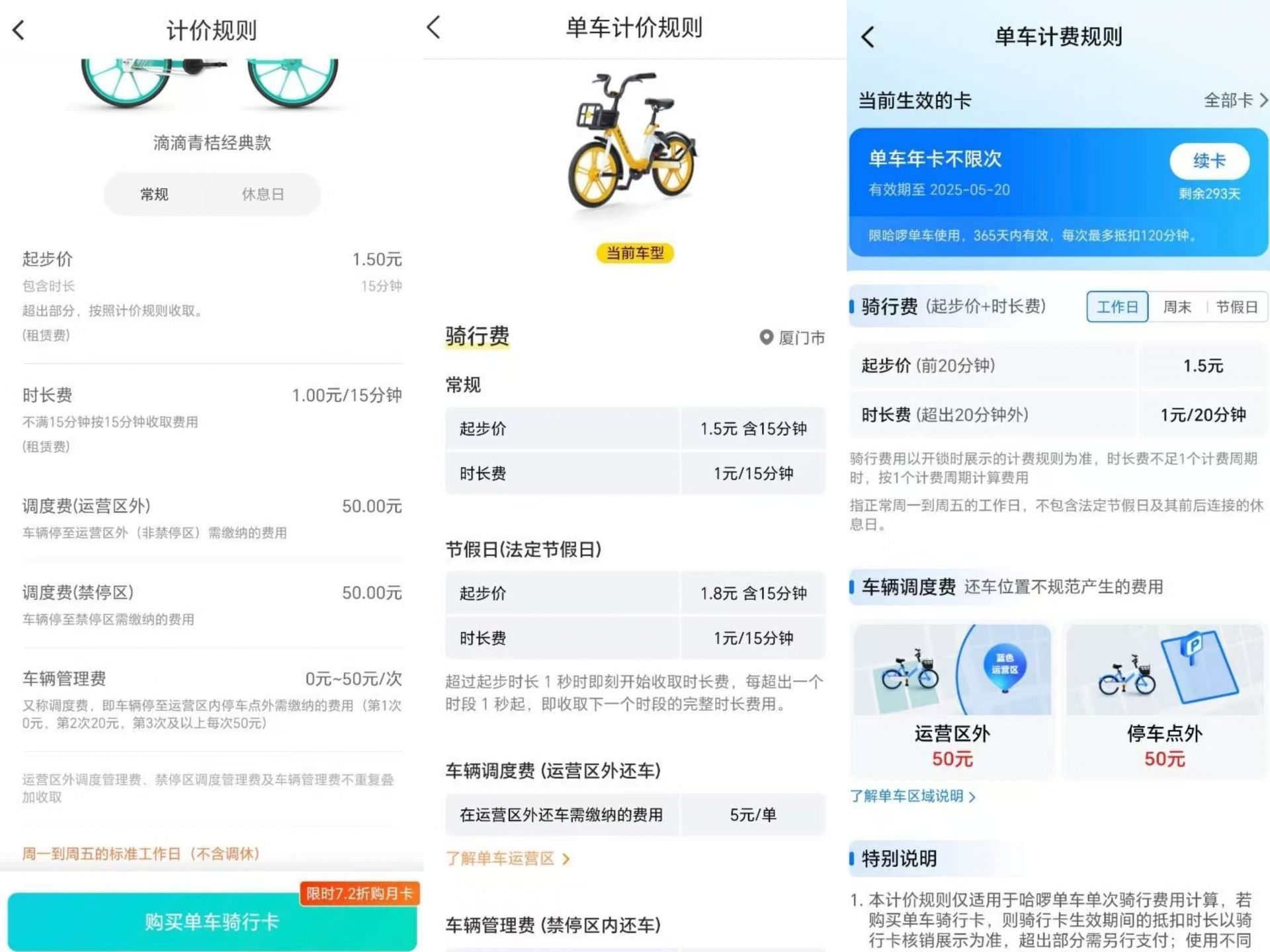与此同时,阅读特别新闻记者发现,在一些城市,美团的价格比较高,比如厦门,美团的工作日价格是前15分钟1.5元,然后每15分钟1元,周末价格是前15分钟1.8元,然后每15分钟1元,而哈啰的工作日价格是前20分钟1.5元,每20分钟1元,周末价格不变,假期是前15分钟1.8元,然后每15分钟1元,也就是说,美团的工作日和周末价格都比较高。