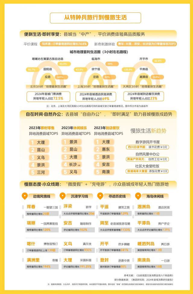 年轻人忙于奔向“县”,这也带动了县城“吃、喝、娱、买”等消费的增长。根据国家统计局的数据,上半年县乡消费品零售额占社会消费品零售额的比例较去年同期增加0.4。%。同时,美团数据显示,2024年上半年,异地游客订单量较去年增长26%。