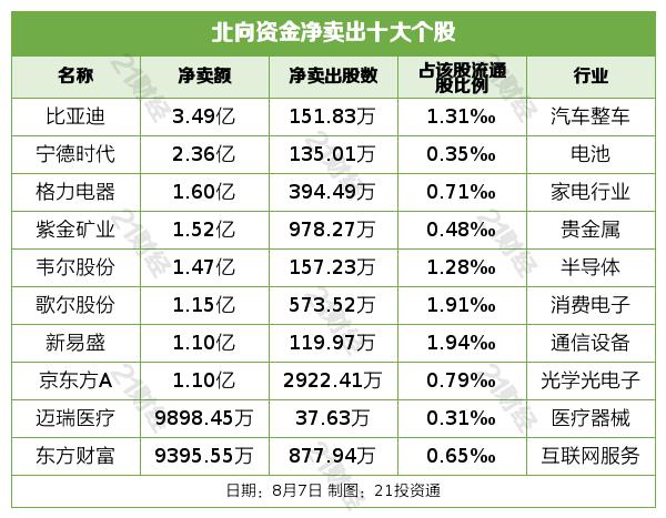 北向资金净卖出比亚迪 ( 002594.SZ ) 、宁德时代 ( 300750.SZ ) 、格力集团 ( 000651.SZ ) 、紫金矿业 ( 601899.SH ) 、韦尔股权 ( 603501.SH ) 居前,其中,比亚迪被净卖出。 3.49 1亿元,宁德时代被净卖出。 2.36 亿元,格力集团的净销售 1.60 亿元,紫金矿业被净卖出。 1.52 亿元,韦尔股权被净卖出。 1.47 亿元。