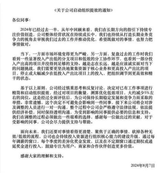 8 月 7 日本,《国家商报》记者证实,该公司发布了《关于公司启动组织提高效率的通知》(即所有获得的信件),并宣布将减少预约。 5% 的岗位。