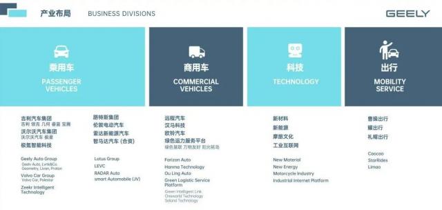 吉利家族拥有吉利、领克、极氪、几何、沃尔沃、极星、路特斯、英伦电动车、远程(新能源商用车)、曹操出行等品牌同时布局在新能源科技、共享出行、车联网、智能驾驶、低轨卫星、激光通信、智能手机、汽车芯片等前沿技术领域。吉利正在向未来的科技生态企业转型。