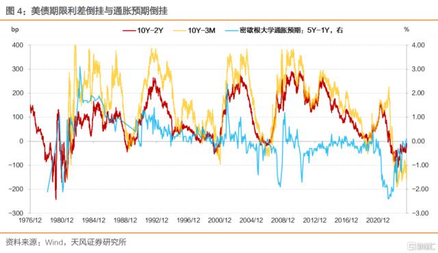本轮倒挂的区别在于通货膨胀预期深度倒挂,影响回报形式。深层次的背景是,前期货币财政宽松和高利率下的财政逆势扩张可能会延缓高利率的抑制效果。换句话说,美国经济可能已经进入衰退,但早期收入补贴和财政逆势扩张相当于提前进行了反周期刺激的跨周期管理。一方面,以短期通胀韧性为代价,对冲经济衰退风险。另一方面,偏向供给侧的政策导向可以稳定长期通胀预期,防止预期脱锚。此外,需要注意的是,在美国经济下行触底的历史过程中,期限利差确实会提前恢复和上升。