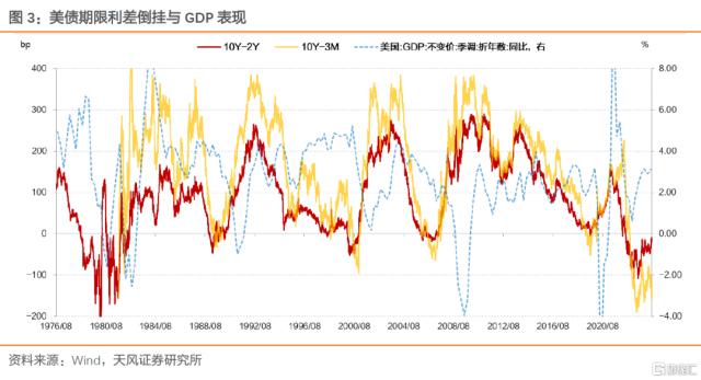 这一轮美债收益率曲线首次倒挂。 2022 年 7 月,距今 24 月份;幅度见顶 2023 年 7 月,距今 12 因此,从历史统计规律中的领先地位来看,美债期间利差倒挂对经济衰退的预测似乎还不能说是无效的。