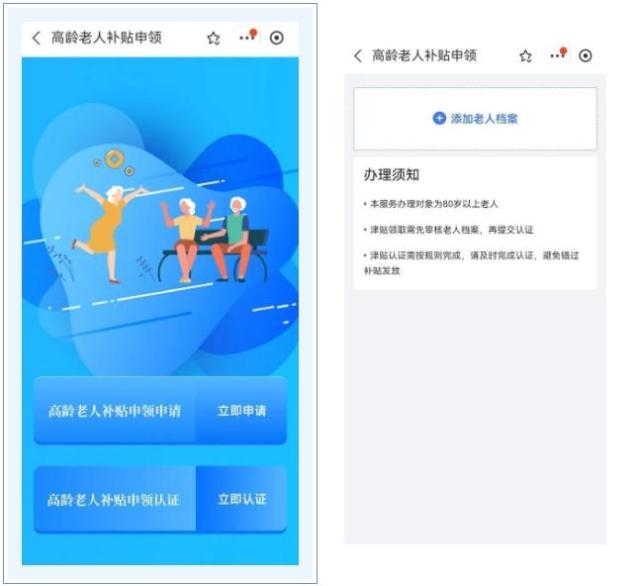 选择老年人补贴申请,添加老年人档案,按页面提示完成办理。