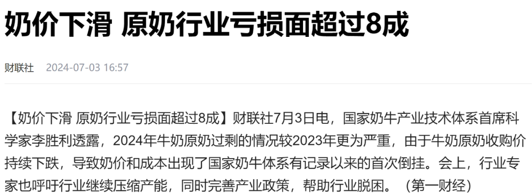 据财联社报道,2023年牛奶原奶过剩的基础上,2024年生产过剩的情况更为严重。