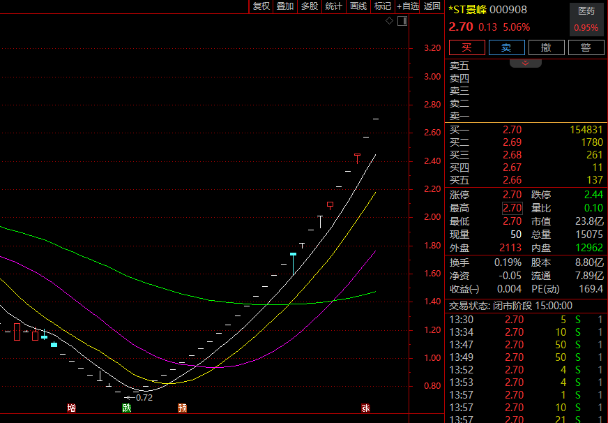 下午ST板块活跃起来,*ST景峰走出9连板,9天累计涨幅达到56.07%,目前该股27天26板;ST百利、ST三圣、ST天邦、ST中装等20多股涨停。