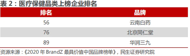 “999”产品在消费者和医药行业中享有很高的认可度,多次被评为“中国认知率最高商标”、“中国最有价值的品牌”。在《2020年中国最有价值品牌100强》榜单中,共有3家企业入选医疗卫生领域,其中华润39位居榜单第89位,品牌价值10.85亿美元。