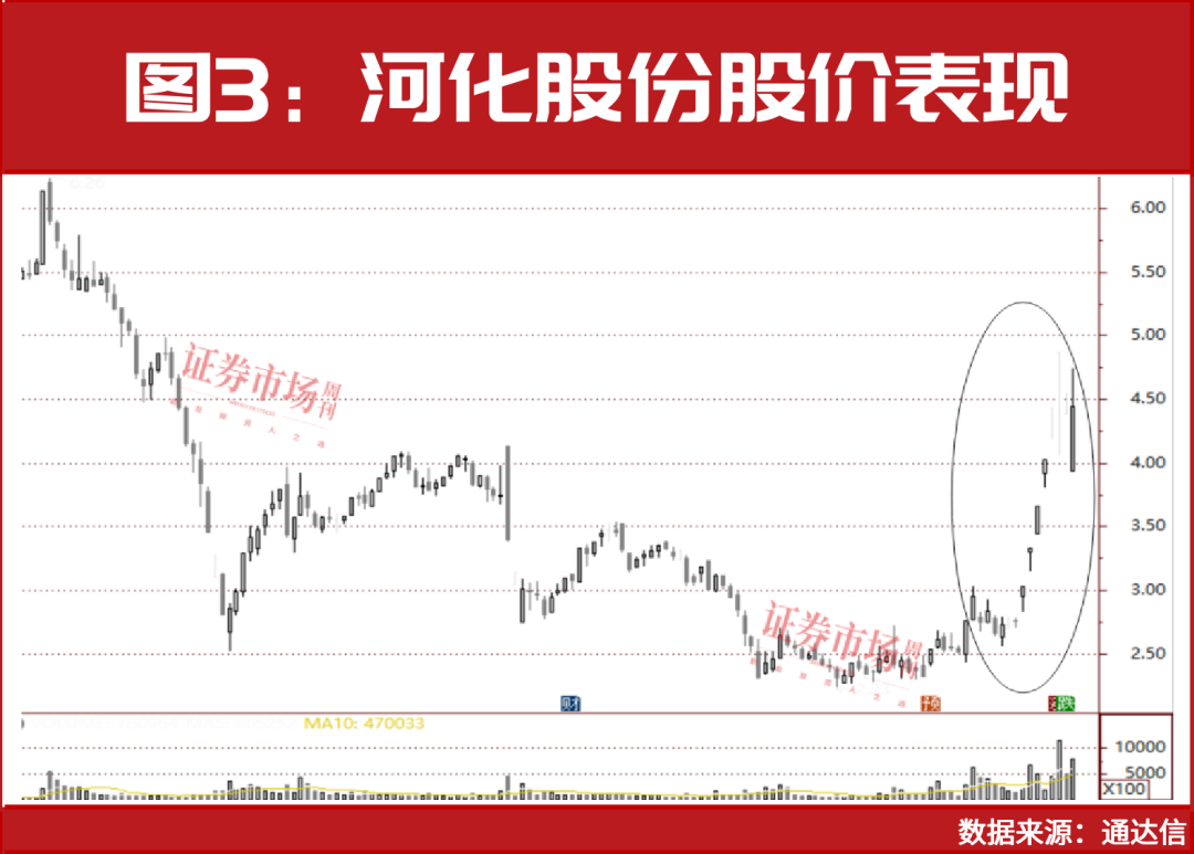 例如,由于医药中间体商品市场需求增加等原因,河化股份于7月10日发布了中期报告预告,上半年净利润预增215万~320万元,同比增长502.75%~797.11%。此后,公司股价出现低位反弹,至今已上涨90%,可见(图3)。