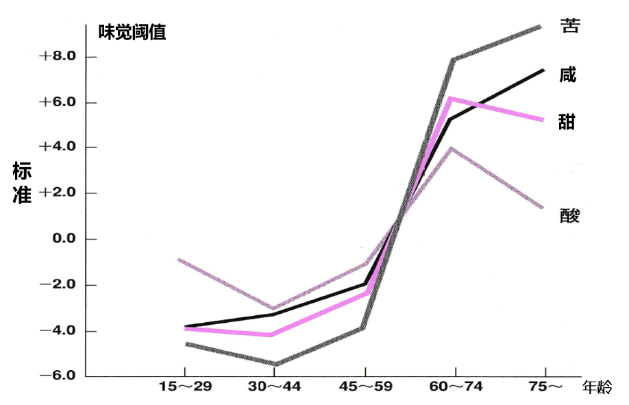 研究味蕾类型味蕾阀值的学者久木野发现,苦味阀值在老化引起的味蕾变化中上升最为明显,其次盐味阀值相对缓慢上升,酸味和甜味阀值明显下降(图-2)。另一项调查报告显示,老年人的性别因素在盐味和酸味上存在显著差异,但甜味和苦味没有显著差异,女性的味蕾识别能力比男性更敏感。与年龄相关的比较研究表明,老年人在盐味、甜味、苦味等方面的阀值明显高于年轻人。还有就细胞组织水平和功能程度而言,研究味蕾会随着年龄的增长而改变。第一,由于舌粘膜上乳头萎缩,细胞组织程度下降(男性从50-60岁开始,女性从40-50岁开始)。;第二,味蕾从40岁开始萎缩(60岁以后对味蕾的影响就没有了)。就功能性而言,首先是味蕾的缓慢化 第二,味蕾阀值上升(也有年龄增长但味蕾能力不下降的),其中60-74岁的盐味是15-9岁的3.8倍,75-89岁的盐味是4.4倍(否则达不到同样的味蕾)。在苦味和甜味方面,老年人不到年轻人的两倍;但是酸味没有太大变化。图-2显示了各种味蕾阀值随年龄增长而变化。